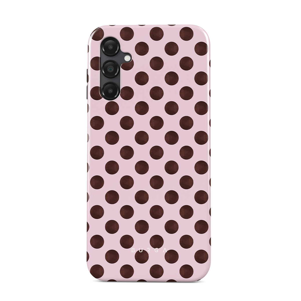このデザインの特徴:茶色の水玉模様が施されたピンクの背景、レトロな水玉パターンが特徴です。