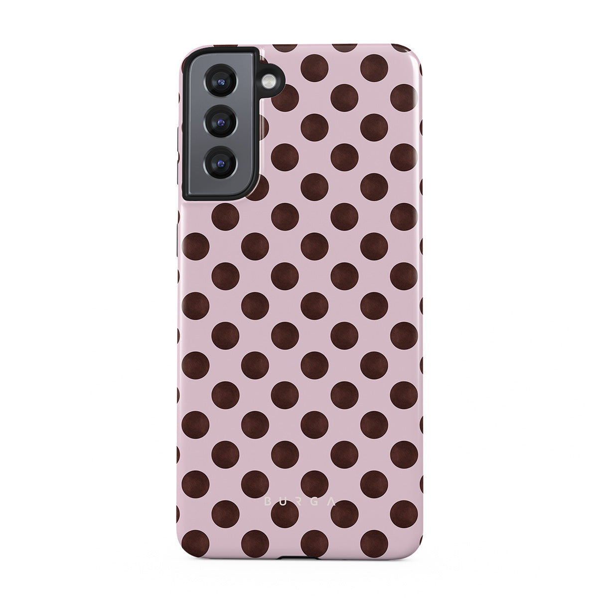 このデザインの特徴:茶色の水玉模様が施されたピンクの背景、レトロな水玉パターンが特徴です。
