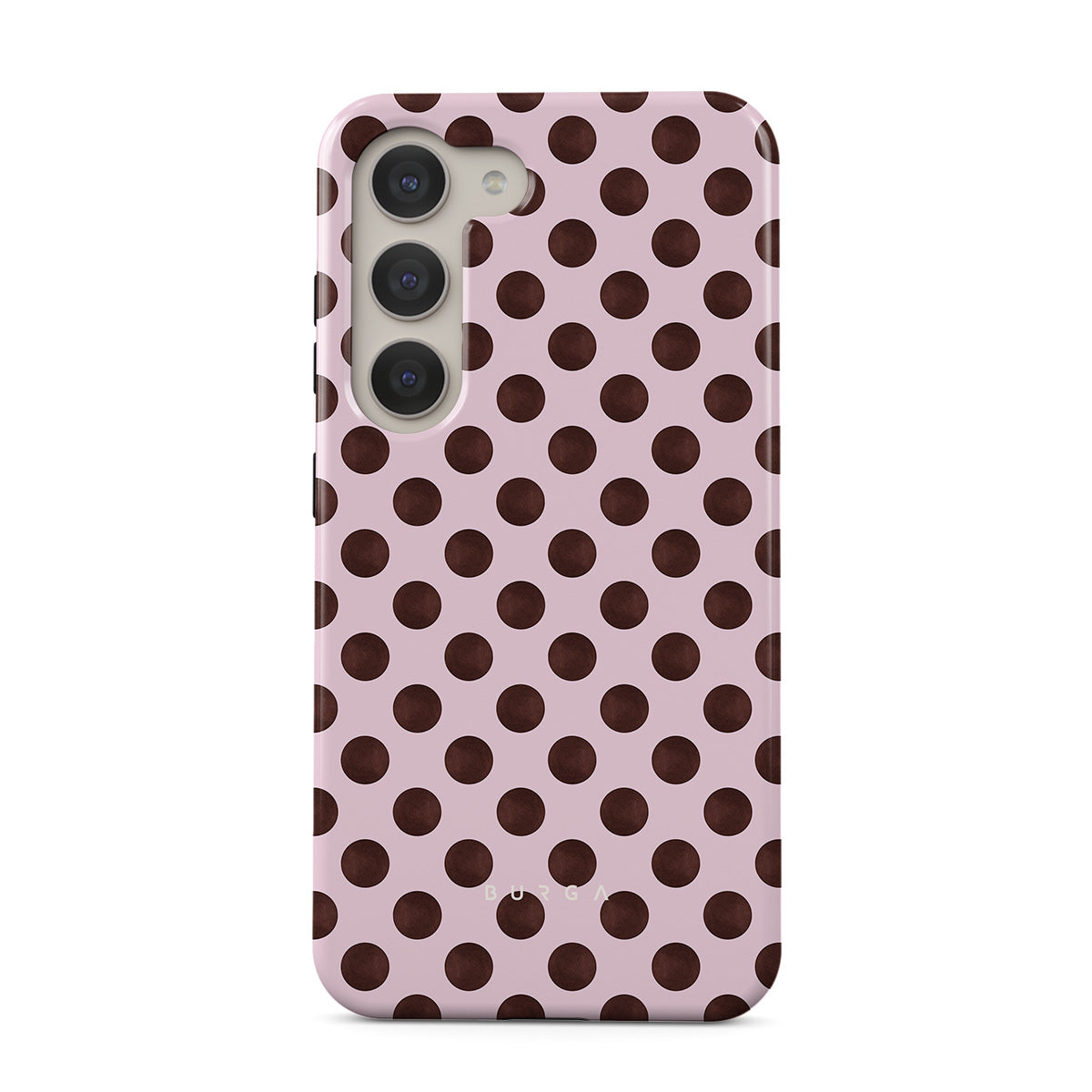このデザインの特徴:茶色の水玉模様が施されたピンクの背景、レトロな水玉パターンが特徴です。