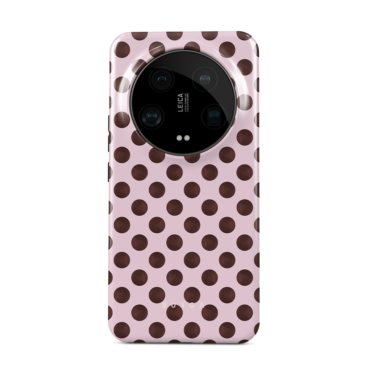 このデザインの特徴:茶色の水玉模様が施されたピンクの背景、レトロな水玉パターンが特徴です。