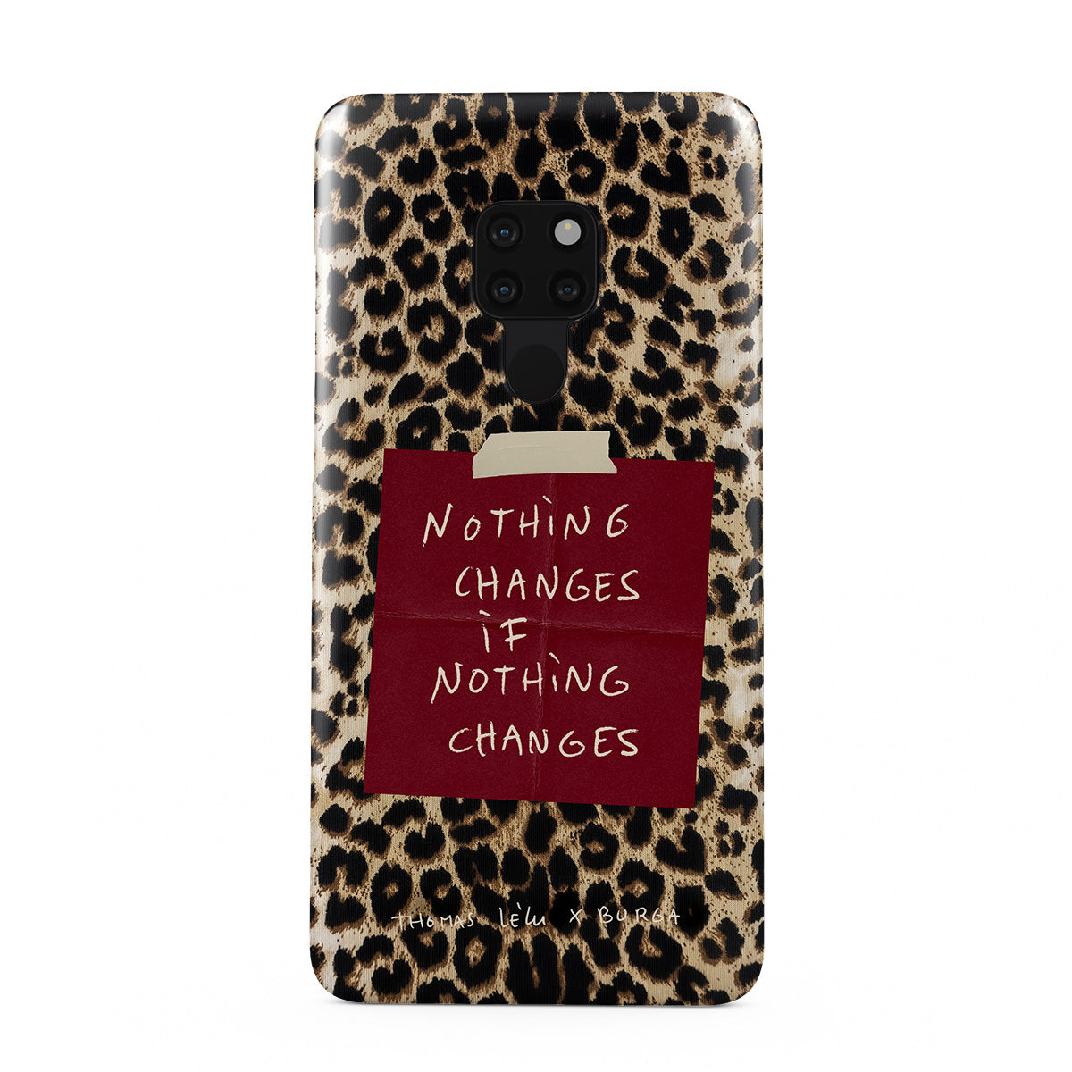 このデザインの特徴:筆記体の文字、引用文、赤い付箋、アニマル柄プリント