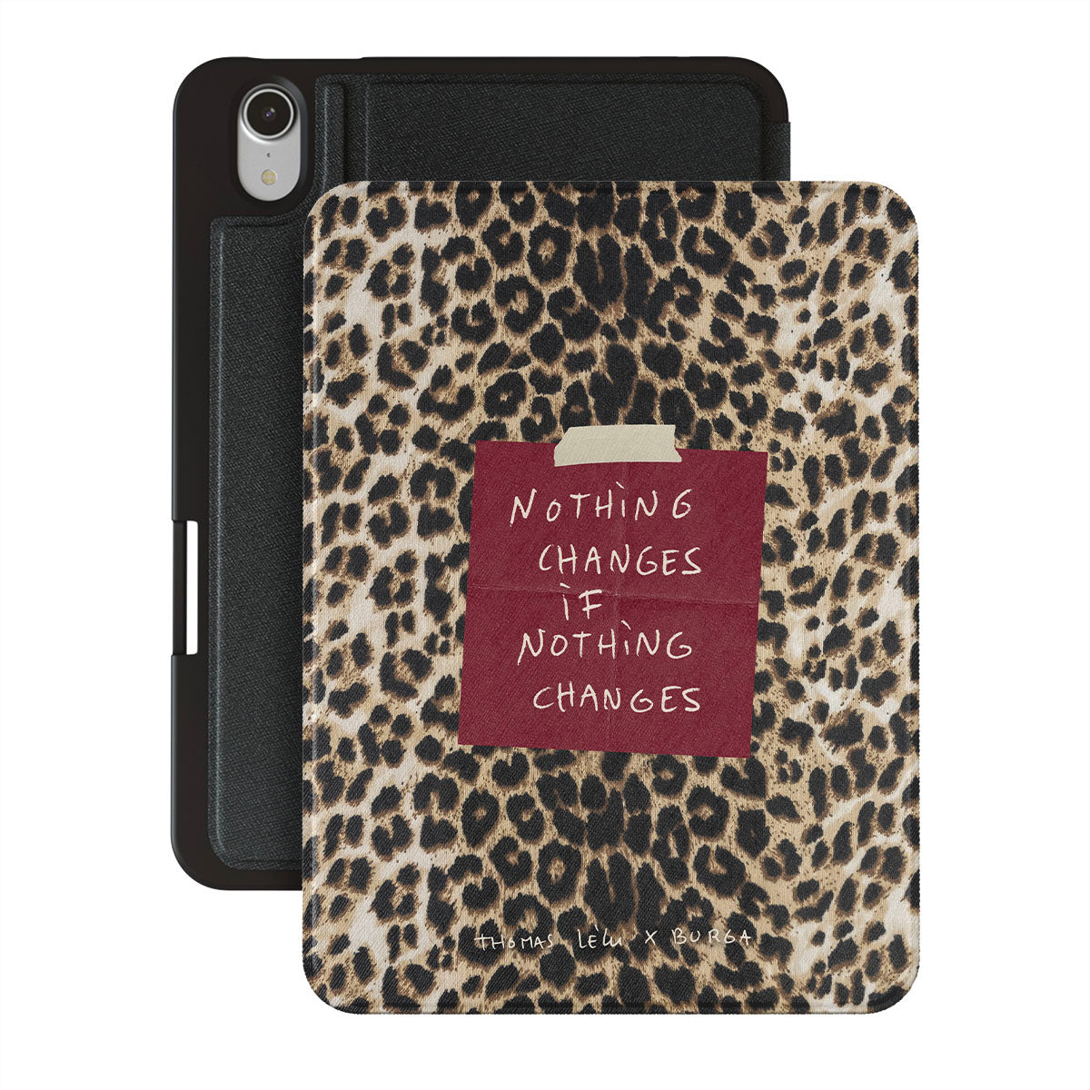 このデザインの特徴:筆記体の文字、引用文、赤い付箋、アニマル柄プリント