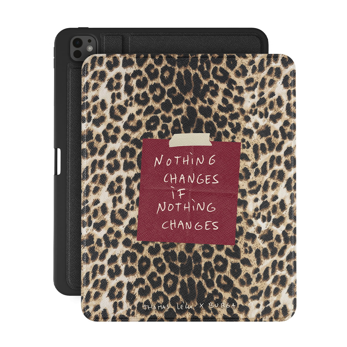 このデザインの特徴:筆記体の文字、引用文、赤い付箋、アニマル柄プリント