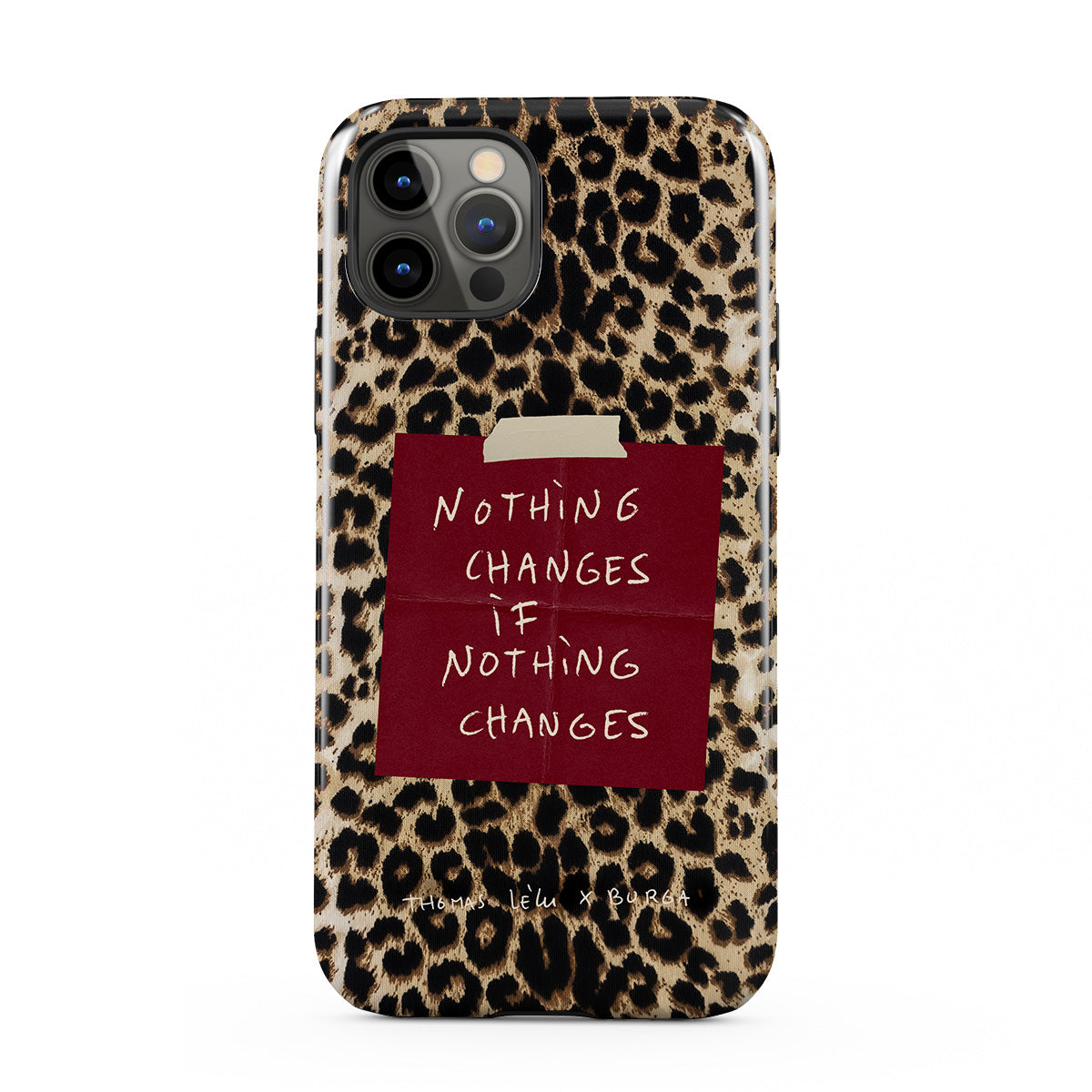 このデザインの特徴:筆記体の文字、引用文、赤い付箋、アニマル柄プリント