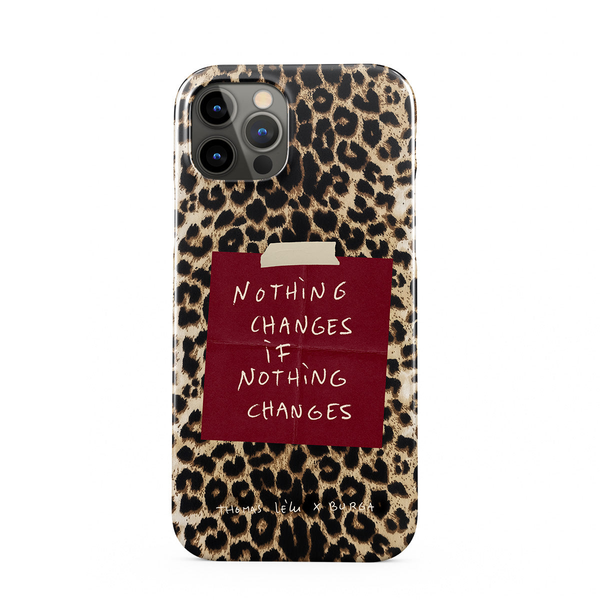 このデザインの特徴:筆記体の文字、引用文、赤い付箋、アニマル柄プリント