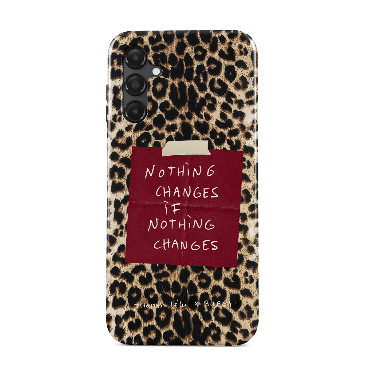 このデザインの特徴:筆記体の文字、引用文、赤い付箋、アニマル柄プリント