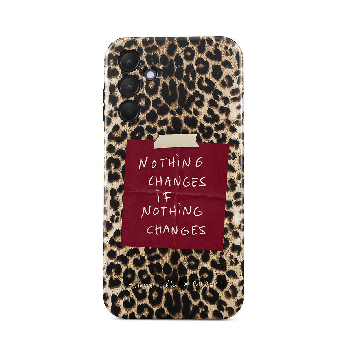 このデザインの特徴:筆記体の文字、引用文、赤い付箋、アニマル柄プリント