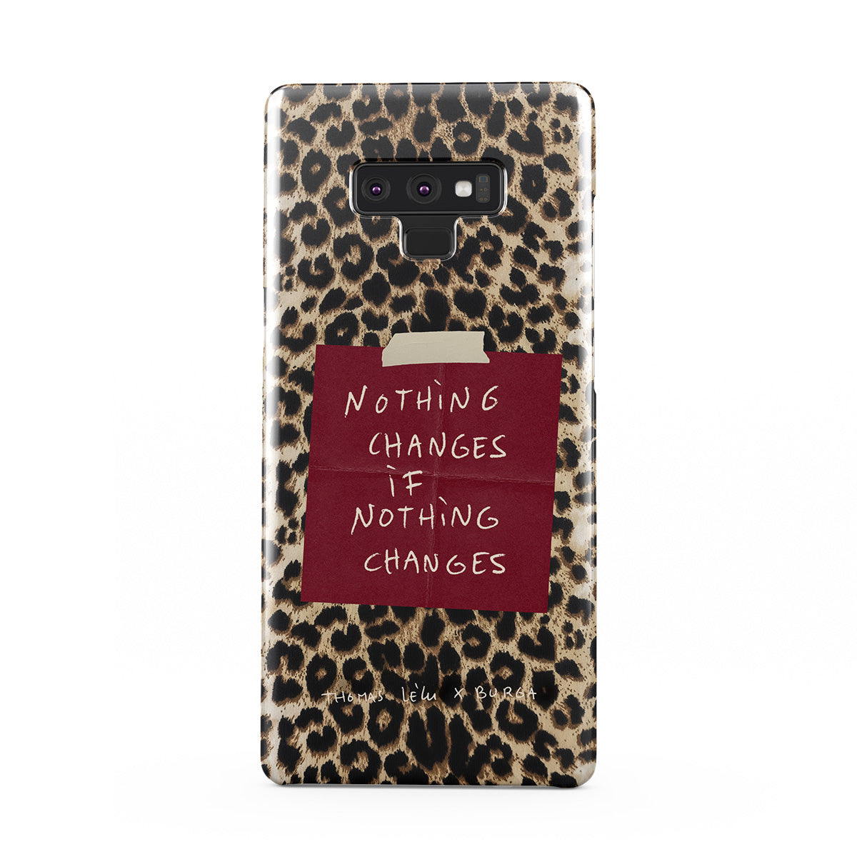 このデザインの特徴:筆記体の文字、引用文、赤い付箋、アニマル柄プリント