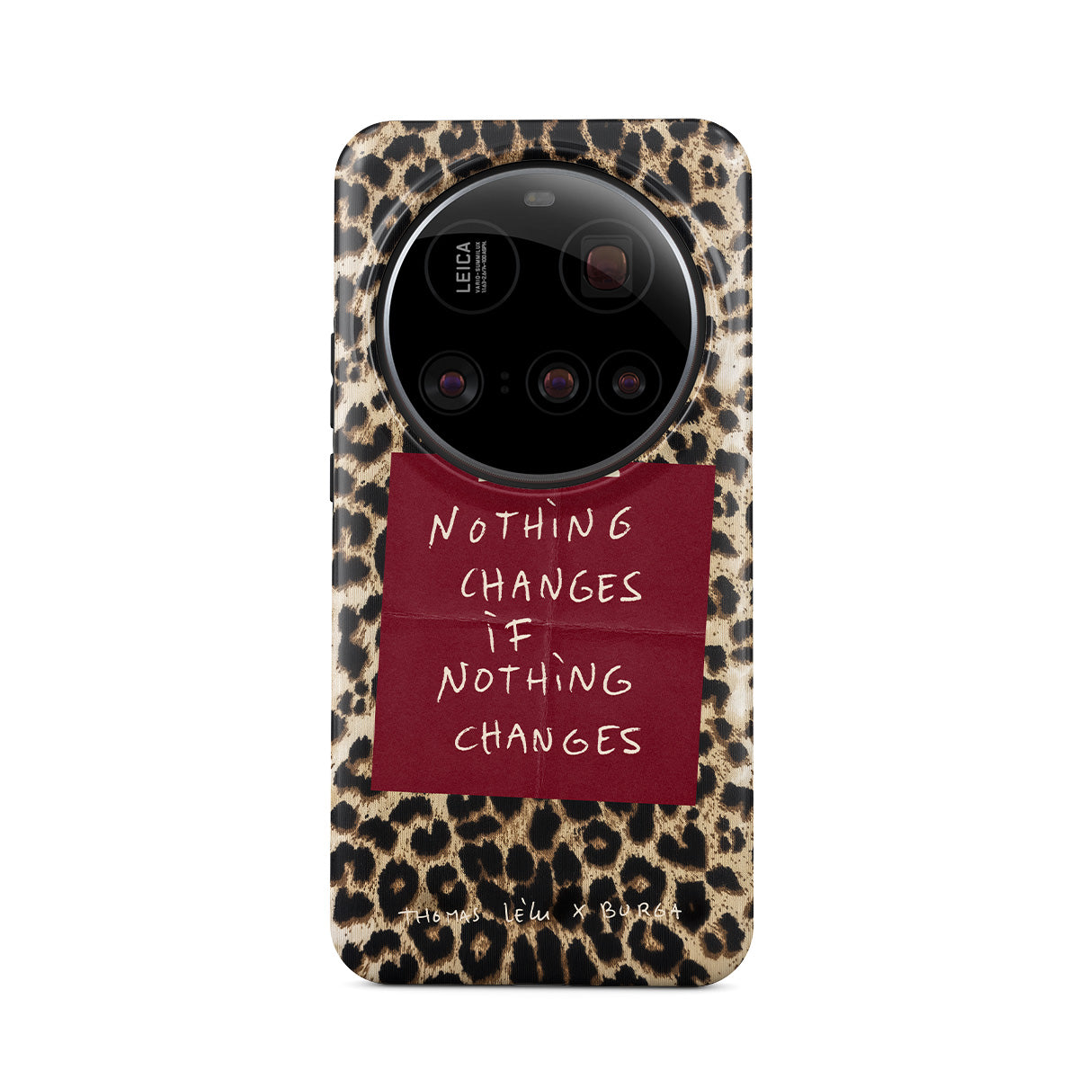このデザインの特徴:筆記体の文字、引用文、赤い付箋、アニマル柄プリント