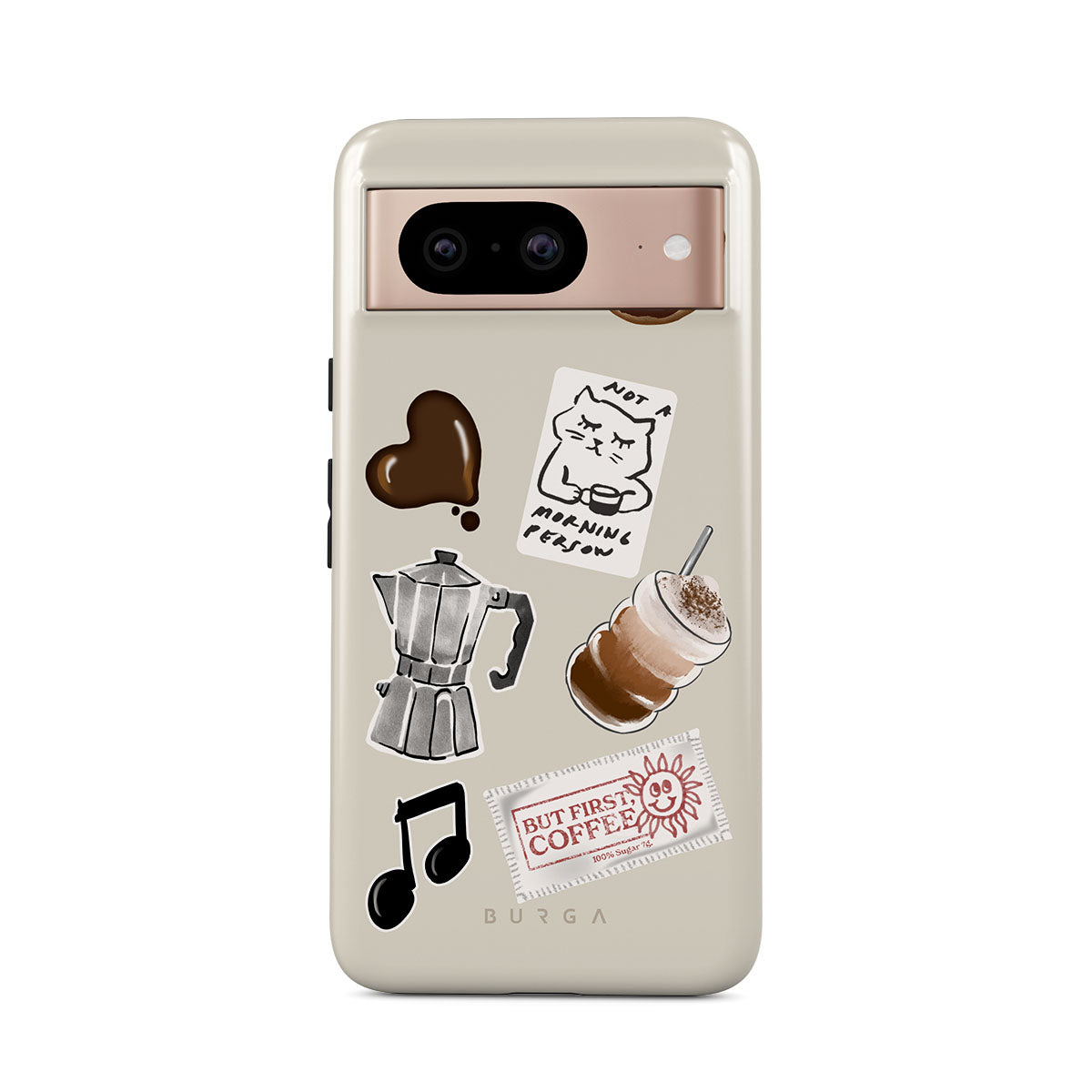 このデザインの特徴:、モカポット、フラッペ、シナモンロール、チョコレートハート、「Not a morning person」ステッカー、「But First, Coffee」レシート、音符が含まれています。