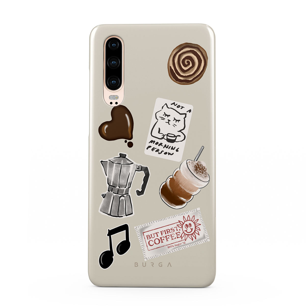 このデザインの特徴:、モカポット、フラッペ、シナモンロール、チョコレートハート、「Not a morning person」ステッカー、「But First, Coffee」レシート、音符が含まれています。