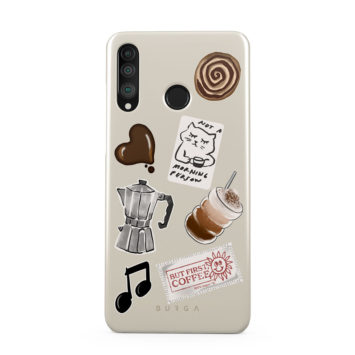 このデザインの特徴:、モカポット、フラッペ、シナモンロール、チョコレートハート、「Not a morning person」ステッカー、「But First, Coffee」レシート、音符が含まれています。