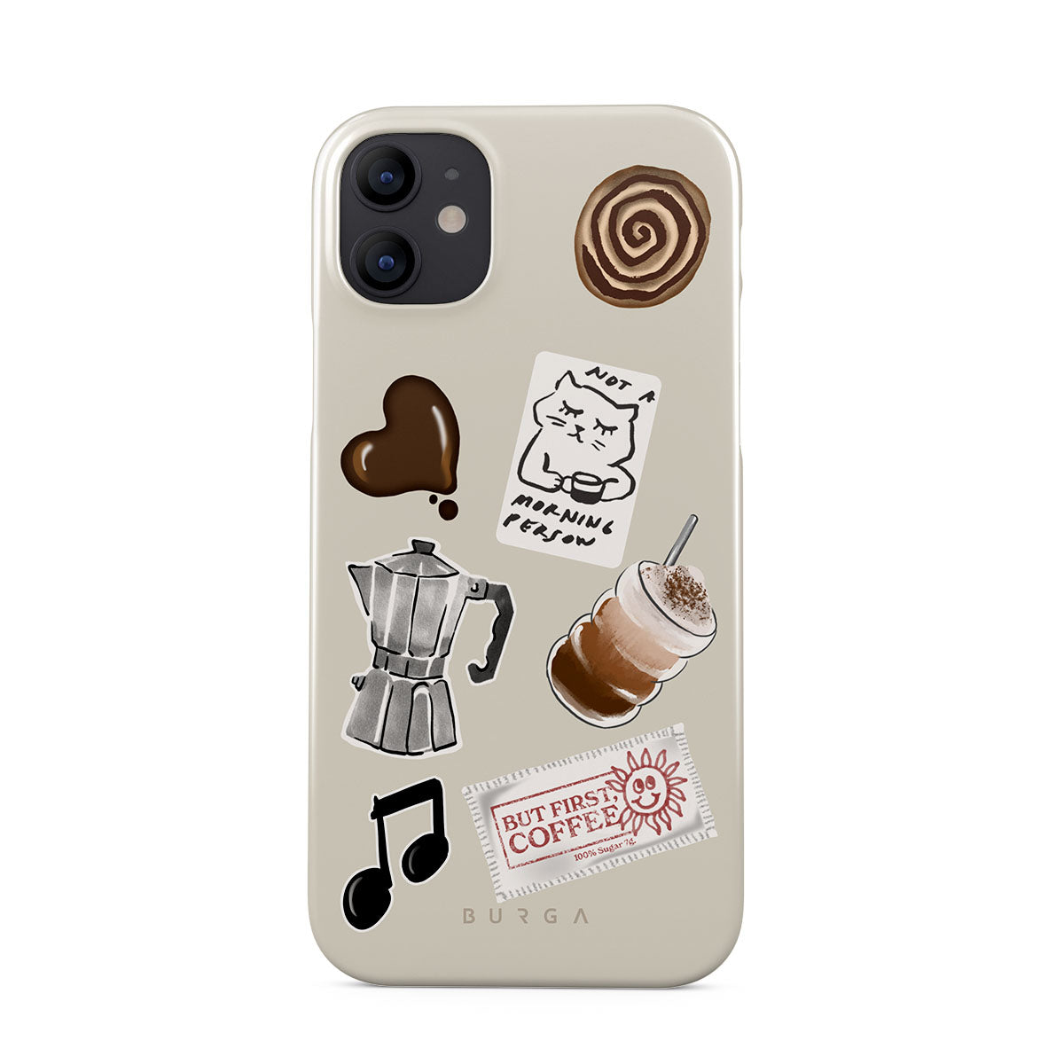 このデザインの特徴:、モカポット、フラッペ、シナモンロール、チョコレートハート、「Not a morning person」ステッカー、「But First, Coffee」レシート、音符が含まれています。