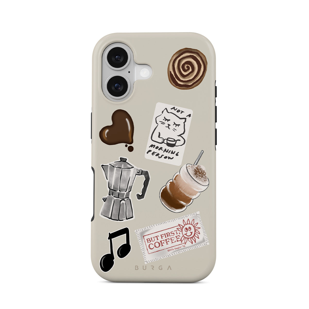 このデザインの特徴:、モカポット、フラッペ、シナモンロール、チョコレートハート、「Not a morning person」ステッカー、「But First, Coffee」レシート、音符が含まれています。