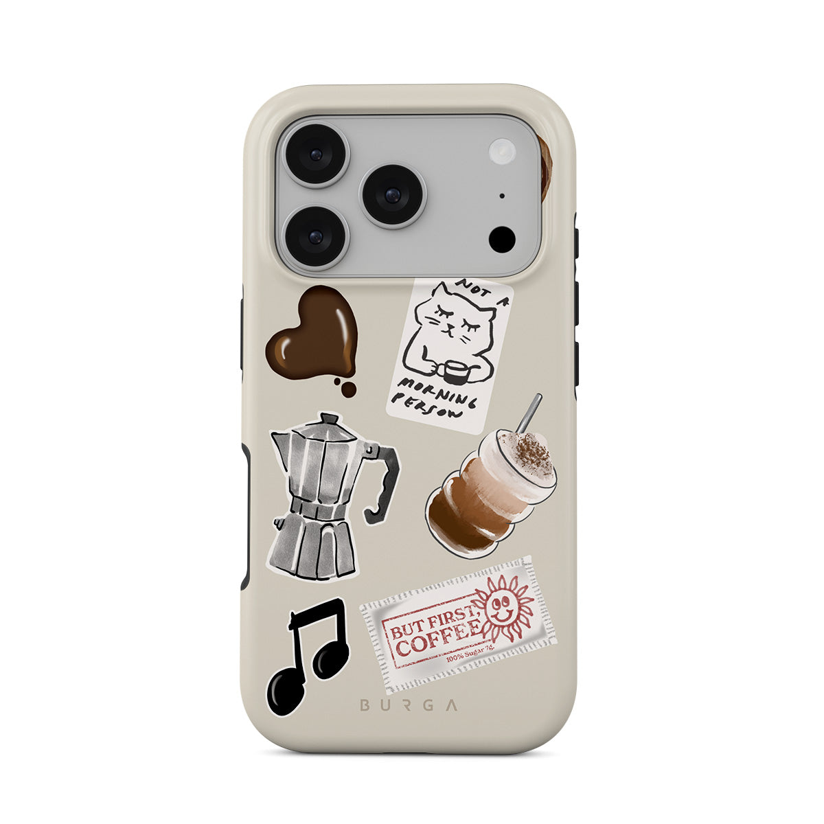 このデザインの特徴:、モカポット、フラッペ、シナモンロール、チョコレートハート、「Not a morning person」ステッカー、「But First, Coffee」レシート、音符が含まれています。