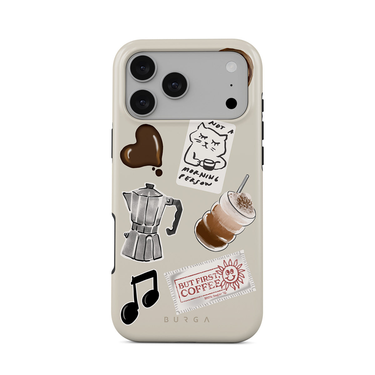 このデザインの特徴:、モカポット、フラッペ、シナモンロール、チョコレートハート、「Not a morning person」ステッカー、「But First, Coffee」レシート、音符が含まれています。