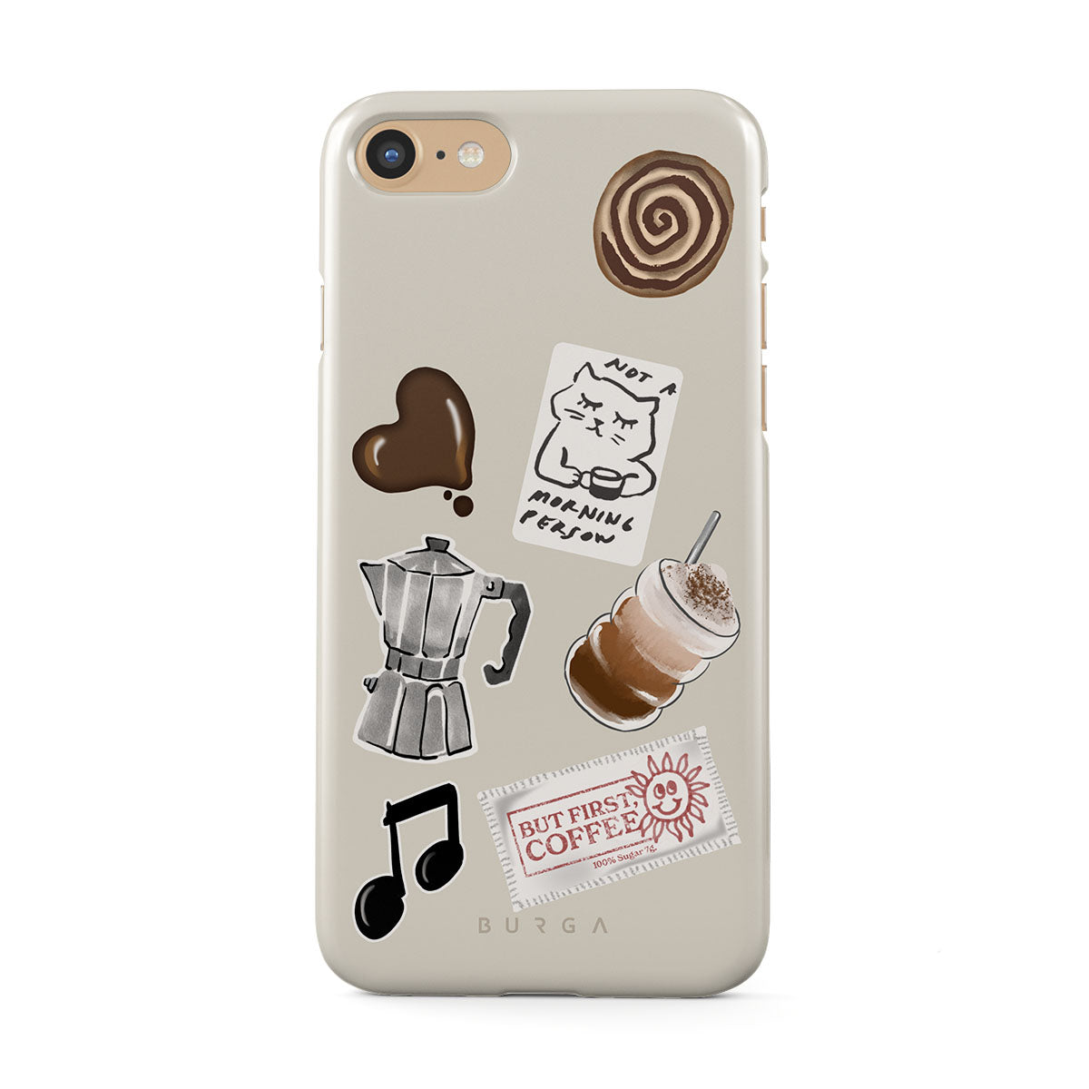 このデザインの特徴:、モカポット、フラッペ、シナモンロール、チョコレートハート、「Not a morning person」ステッカー、「But First, Coffee」レシート、音符が含まれています。