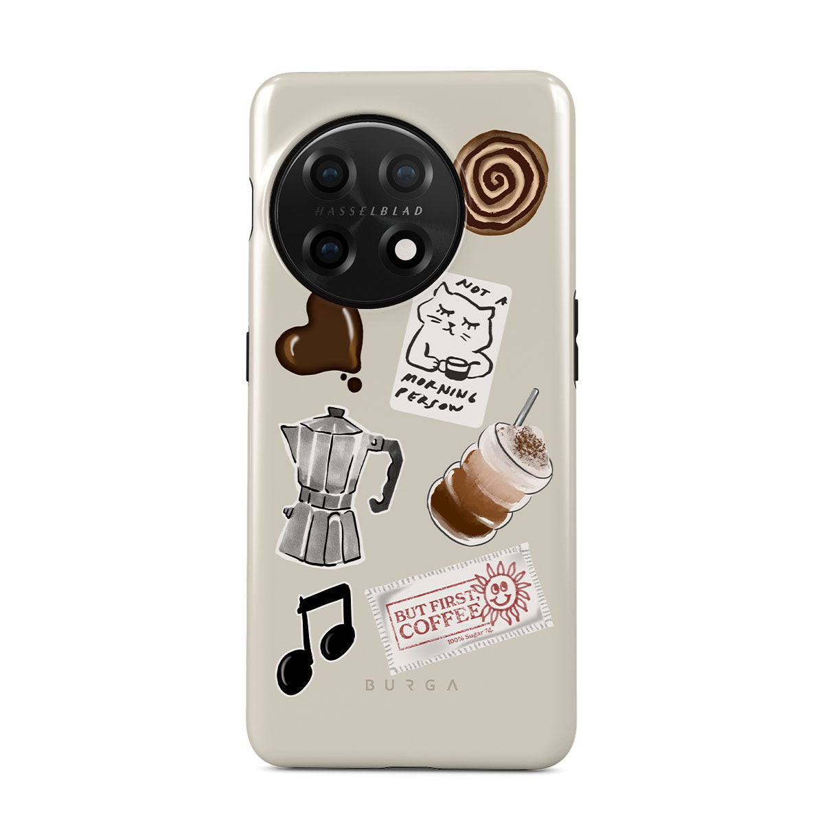 このデザインの特徴:、モカポット、フラッペ、シナモンロール、チョコレートハート、「Not a morning person」ステッカー、「But First, Coffee」レシート、音符が含まれています。
