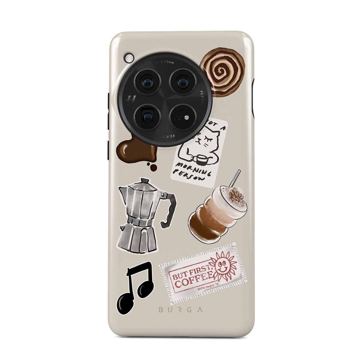 このデザインの特徴:、モカポット、フラッペ、シナモンロール、チョコレートハート、「Not a morning person」ステッカー、「But First, Coffee」レシート、音符が含まれています。