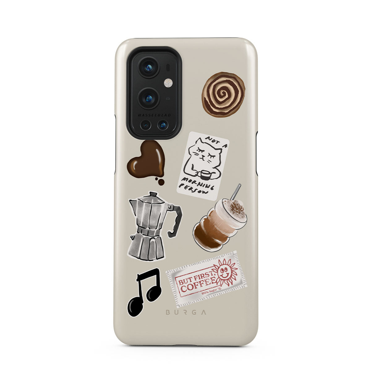 このデザインの特徴:、モカポット、フラッペ、シナモンロール、チョコレートハート、「Not a morning person」ステッカー、「But First, Coffee」レシート、音符が含まれています。