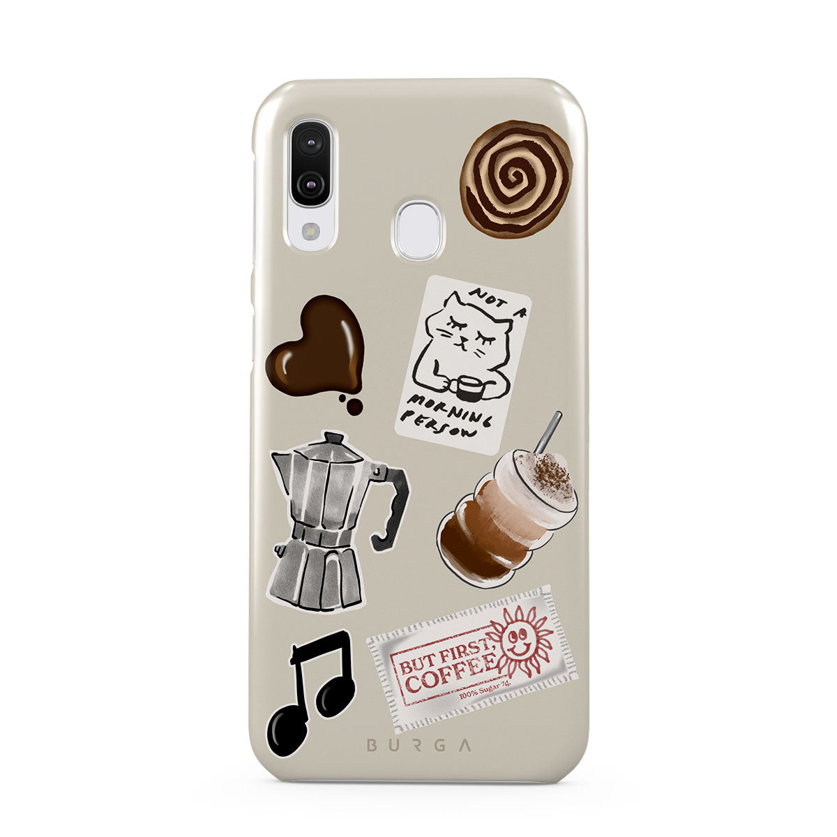 このデザインの特徴:、モカポット、フラッペ、シナモンロール、チョコレートハート、「Not a morning person」ステッカー、「But First, Coffee」レシート、音符が含まれています。