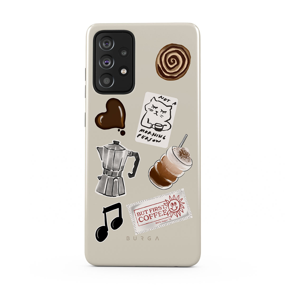 このデザインの特徴:、モカポット、フラッペ、シナモンロール、チョコレートハート、「Not a morning person」ステッカー、「But First, Coffee」レシート、音符が含まれています。