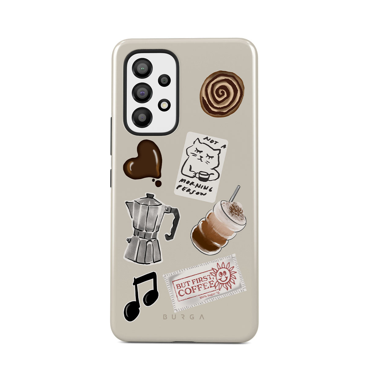 このデザインの特徴:、モカポット、フラッペ、シナモンロール、チョコレートハート、「Not a morning person」ステッカー、「But First, Coffee」レシート、音符が含まれています。