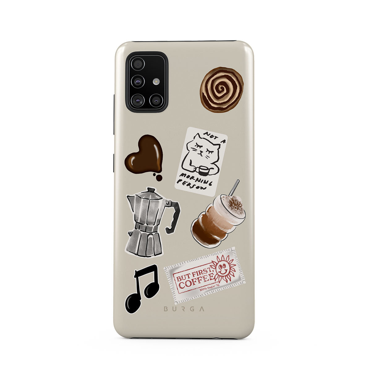 このデザインの特徴:、モカポット、フラッペ、シナモンロール、チョコレートハート、「Not a morning person」ステッカー、「But First, Coffee」レシート、音符が含まれています。