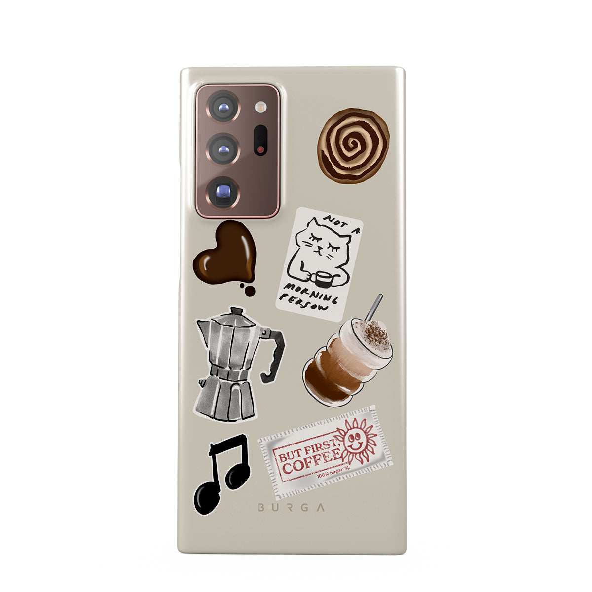 このデザインの特徴:、モカポット、フラッペ、シナモンロール、チョコレートハート、「Not a morning person」ステッカー、「But First, Coffee」レシート、音符が含まれています。