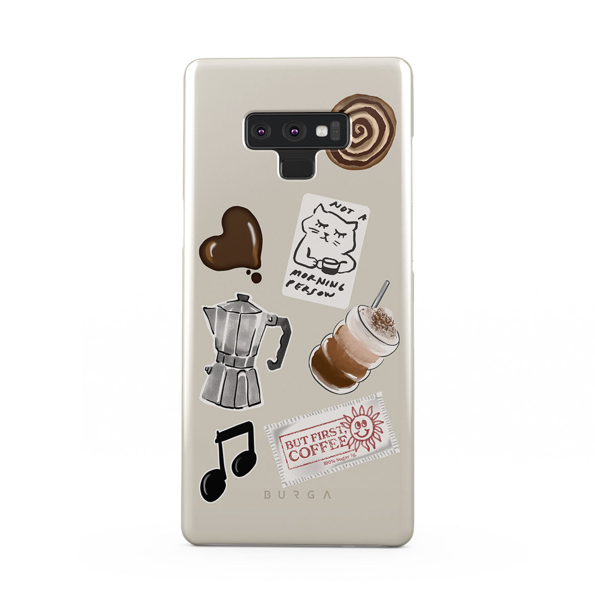 このデザインの特徴:、モカポット、フラッペ、シナモンロール、チョコレートハート、「Not a morning person」ステッカー、「But First, Coffee」レシート、音符が含まれています。