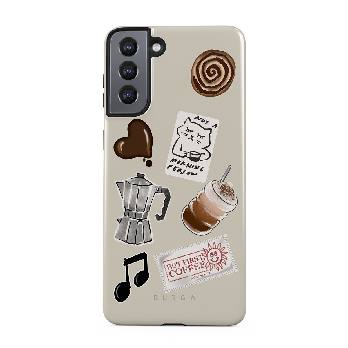このデザインの特徴:、モカポット、フラッペ、シナモンロール、チョコレートハート、「Not a morning person」ステッカー、「But First, Coffee」レシート、音符が含まれています。