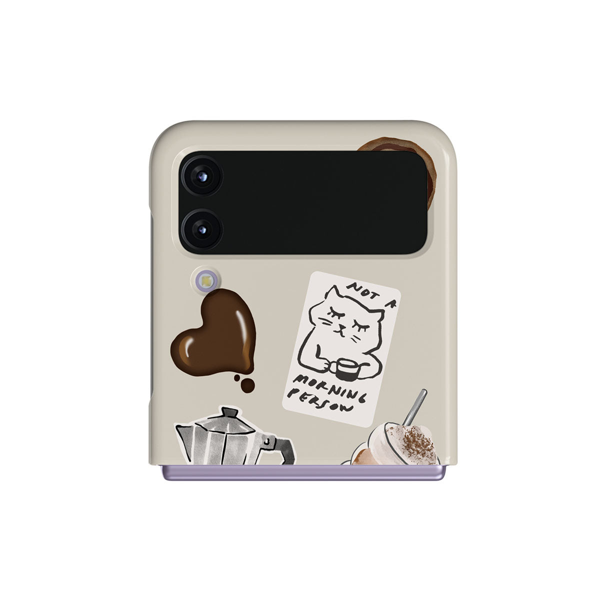 このデザインの特徴:、モカポット、フラッペ、シナモンロール、チョコレートハート、「Not a morning person」ステッカー、「But First, Coffee」レシート、音符が含まれています。