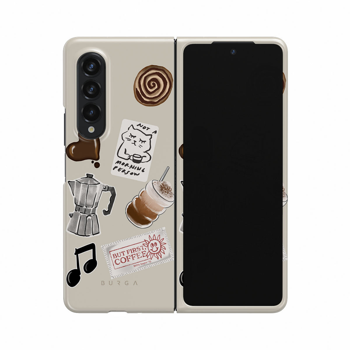 このデザインの特徴:、モカポット、フラッペ、シナモンロール、チョコレートハート、「Not a morning person」ステッカー、「But First, Coffee」レシート、音符が含まれています。