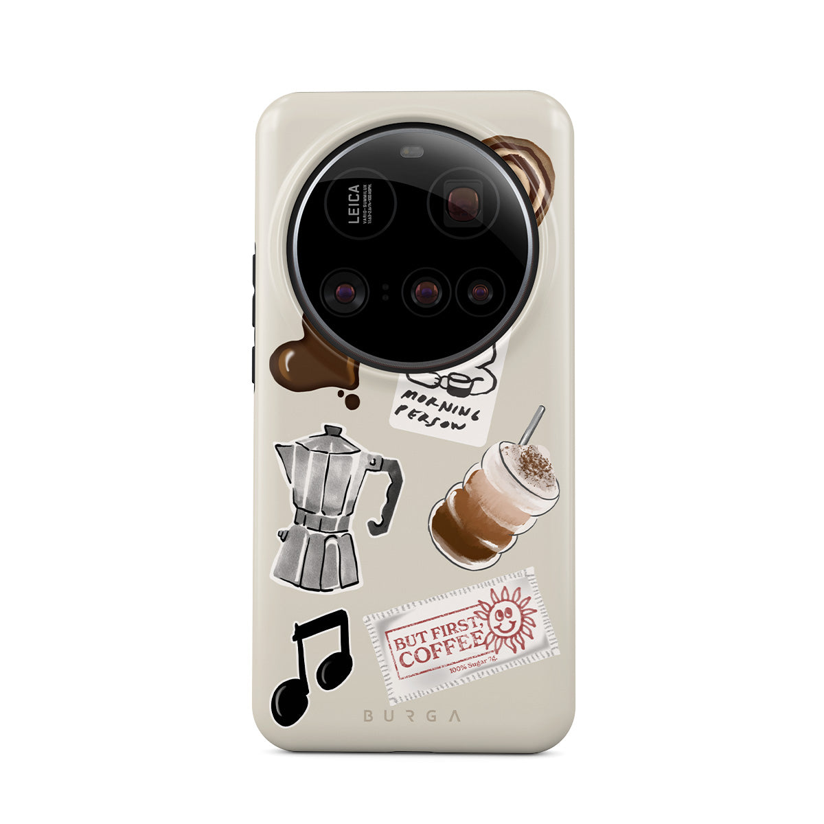 このデザインの特徴:、モカポット、フラッペ、シナモンロール、チョコレートハート、「Not a morning person」ステッカー、「But First, Coffee」レシート、音符が含まれています。