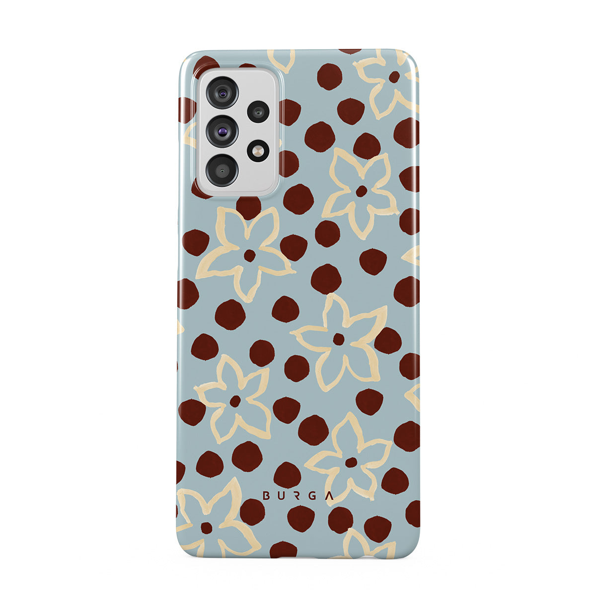 このデザインの特徴:花、ドット柄、ライトブルーの背景