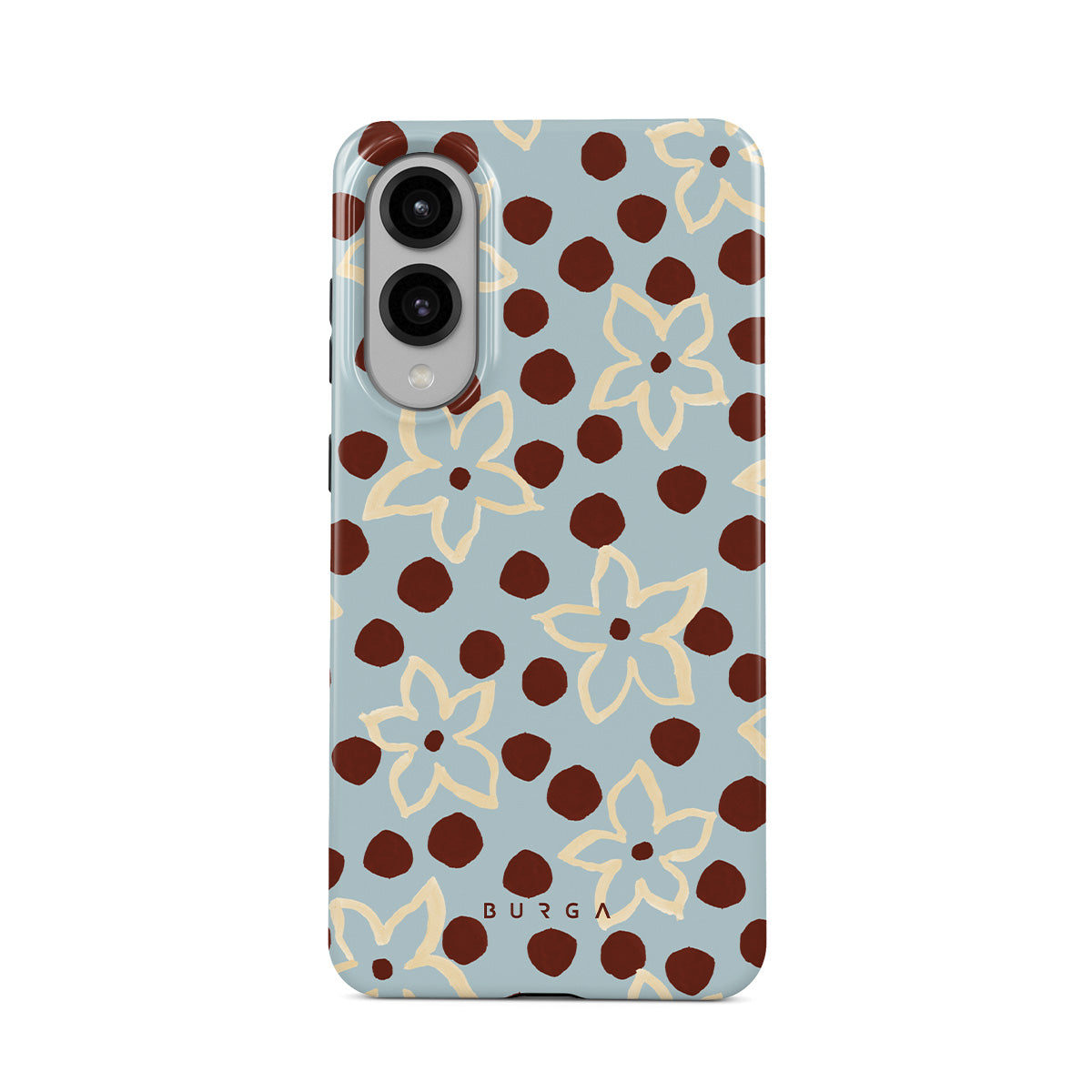 このデザインの特徴:花、ドット柄、ライトブルーの背景