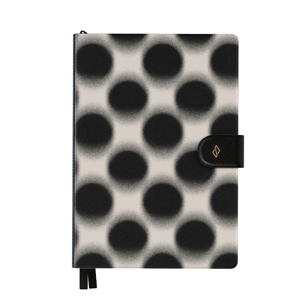 このデザインの特徴:ブラックドット、ミニマルデザイン、ジオメトリック模様、ぼかし効果