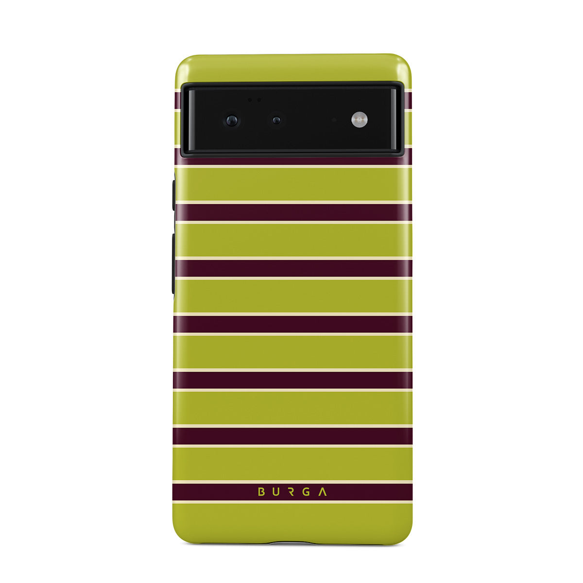 このデザインの特徴:ライムグリーンとバーガンディの太い横縞が特徴です。