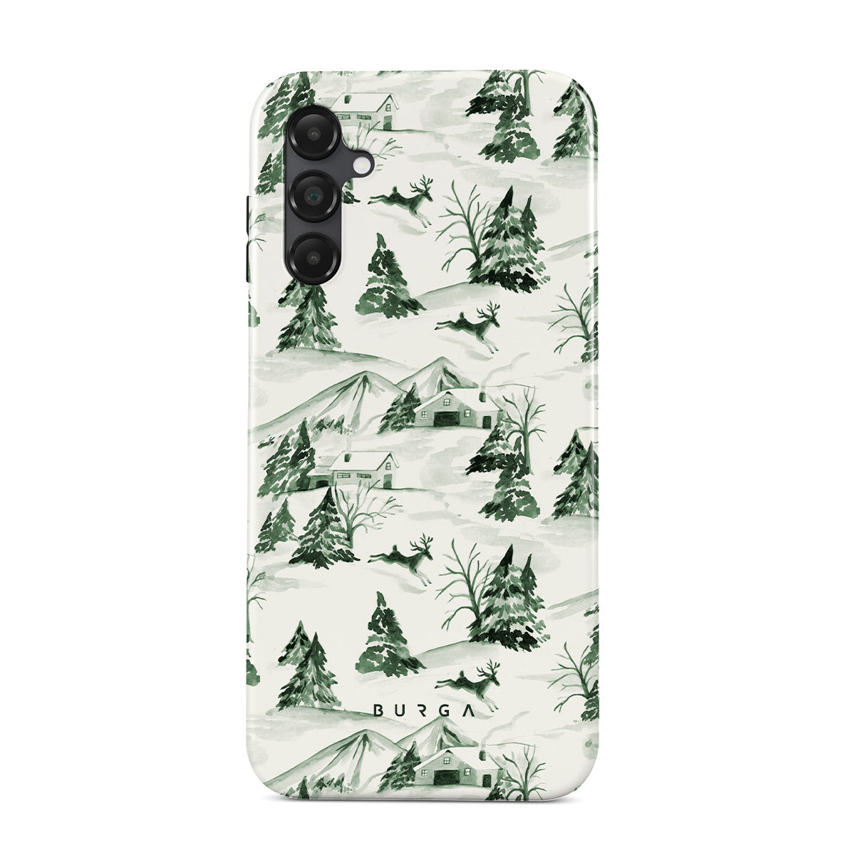 このデザインの特徴:冬の森の風景、松の木、雪景色、緑と白の自然なパターン、森のクリスマス、常緑樹、ヴィンテージのイラストスタイル