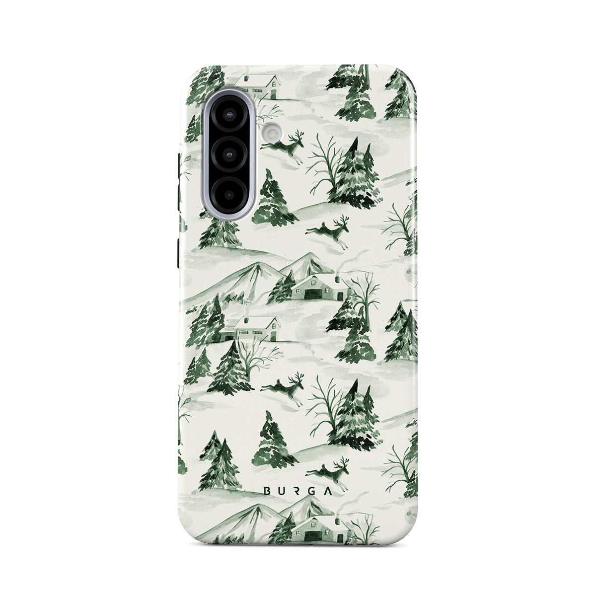 このデザインの特徴:冬の森の風景、松の木、雪景色、緑と白の自然なパターン、森のクリスマス、常緑樹、ヴィンテージのイラストスタイル