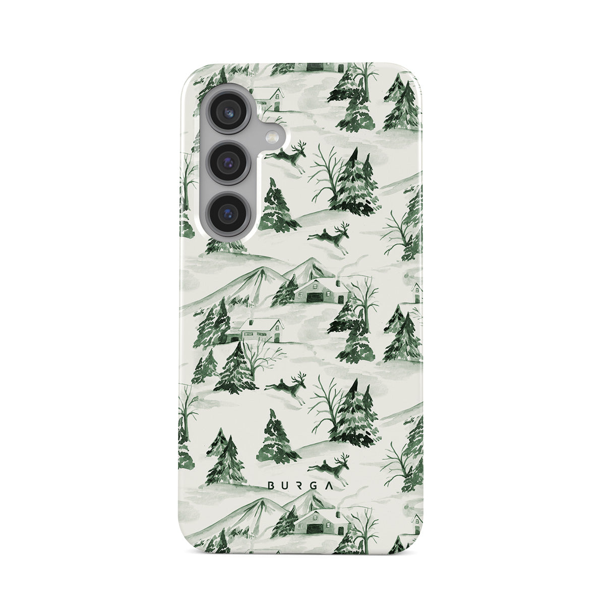 このデザインの特徴:冬の森の風景、松の木、雪景色、緑と白の自然なパターン、森のクリスマス、常緑樹、ヴィンテージのイラストスタイル