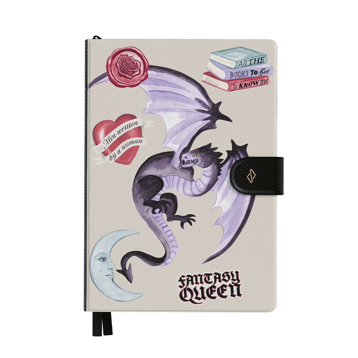このデザインの特徴:、紫色のドラゴン、「Fantasy Queen」ステッカー、三日月、紫色の封蝋、メッセージ付きのハート、本が含まれています。