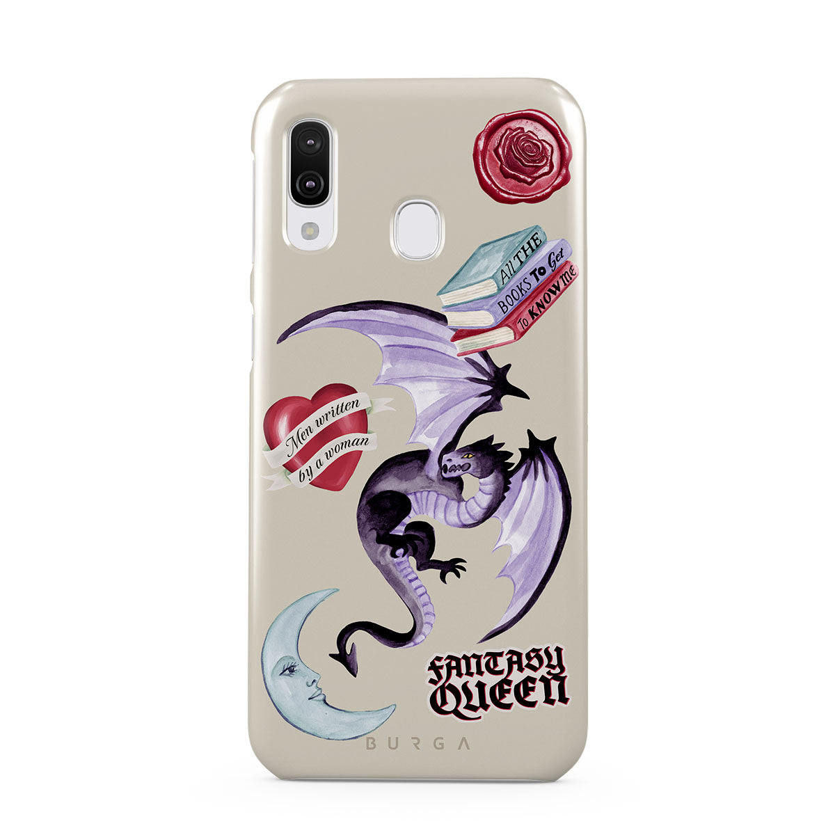 このデザインの特徴:、紫色のドラゴン、「Fantasy Queen」ステッカー、三日月、紫色の封蝋、メッセージ付きのハート、本が含まれています。