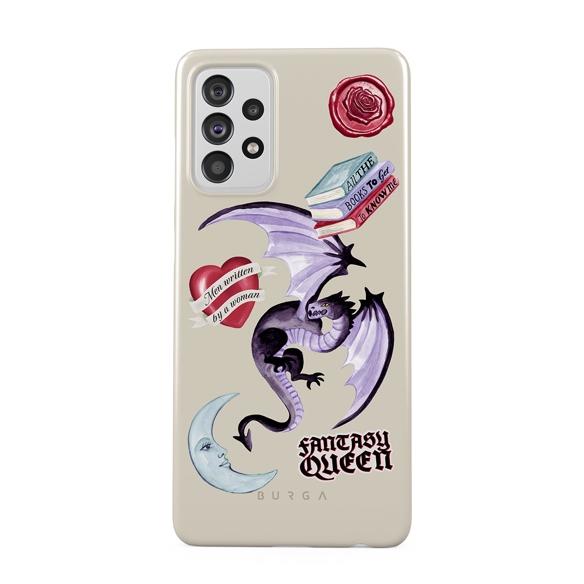 このデザインの特徴:、紫色のドラゴン、「Fantasy Queen」ステッカー、三日月、紫色の封蝋、メッセージ付きのハート、本が含まれています。