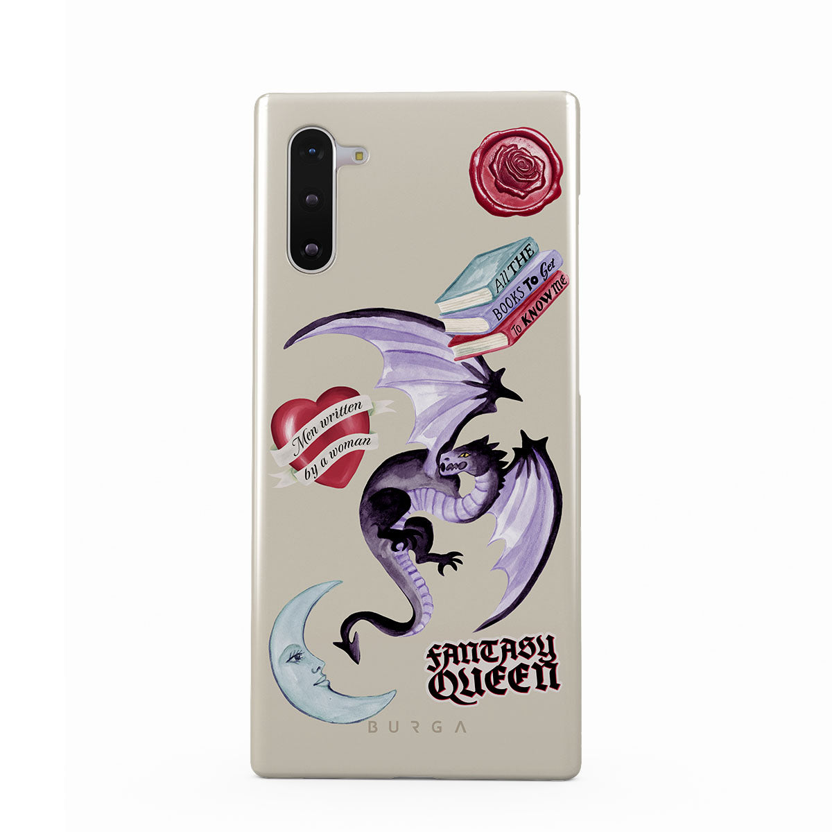 このデザインの特徴:、紫色のドラゴン、「Fantasy Queen」ステッカー、三日月、紫色の封蝋、メッセージ付きのハート、本が含まれています。