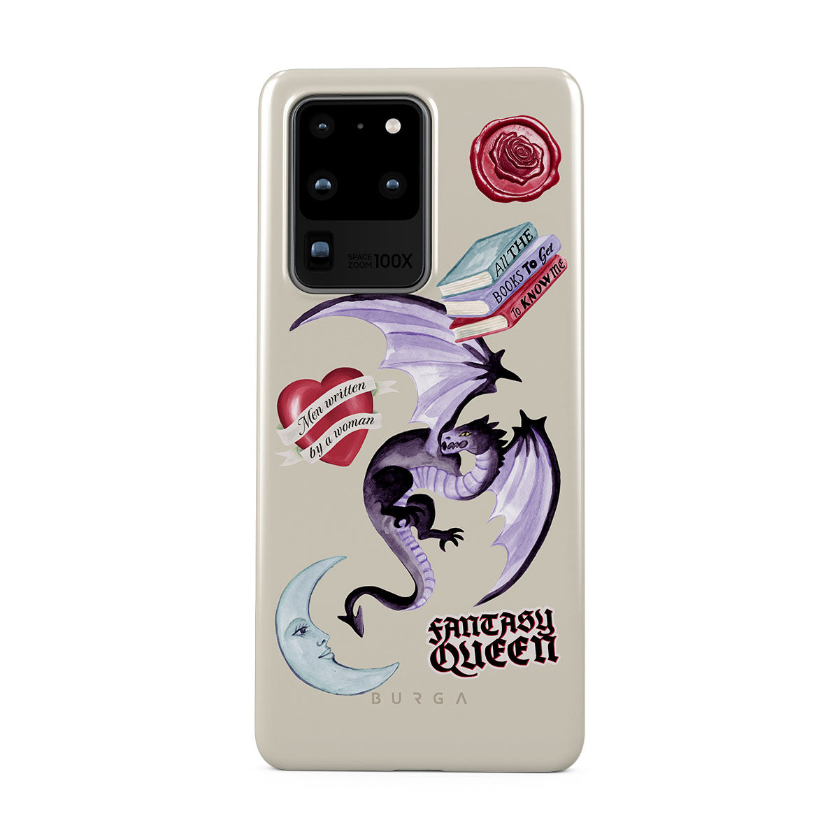 このデザインの特徴:、紫色のドラゴン、「Fantasy Queen」ステッカー、三日月、紫色の封蝋、メッセージ付きのハート、本が含まれています。