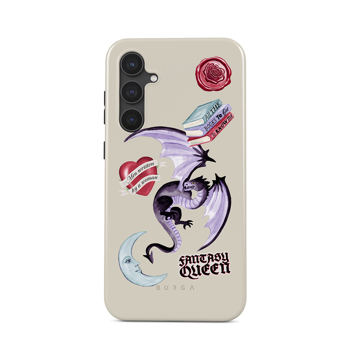 このデザインの特徴:、紫色のドラゴン、「Fantasy Queen」ステッカー、三日月、紫色の封蝋、メッセージ付きのハート、本が含まれています。