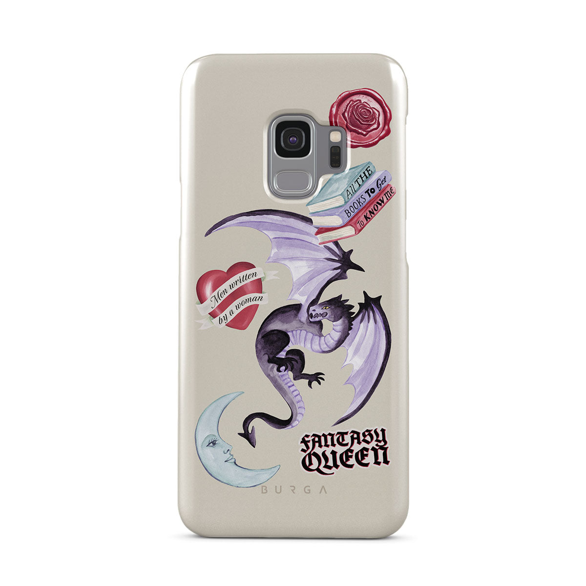 このデザインの特徴:、紫色のドラゴン、「Fantasy Queen」ステッカー、三日月、紫色の封蝋、メッセージ付きのハート、本が含まれています。
