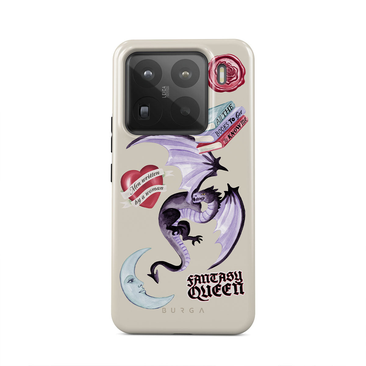 このデザインの特徴:、紫色のドラゴン、「Fantasy Queen」ステッカー、三日月、紫色の封蝋、メッセージ付きのハート、本が含まれています。