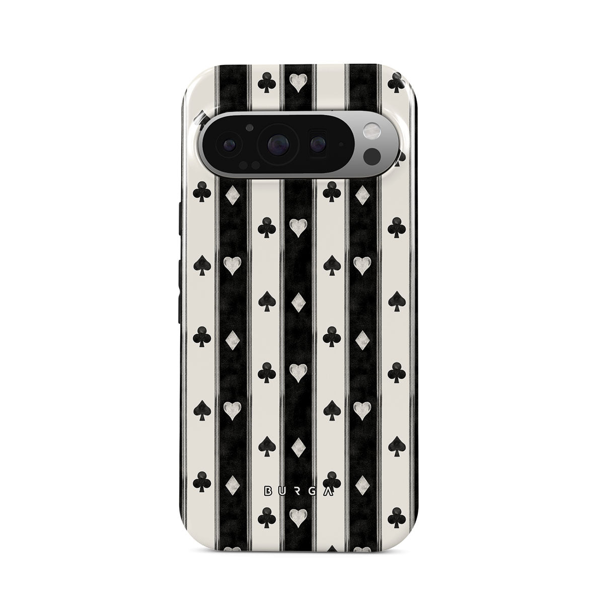 このデザインの特徴黒と白のストライプ、ハート、トランプのスート、ヴィンテージスタイル
